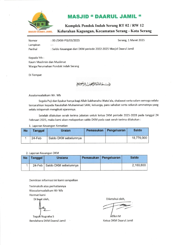 Saldo Awal DKM Masjid Daarul Jamil