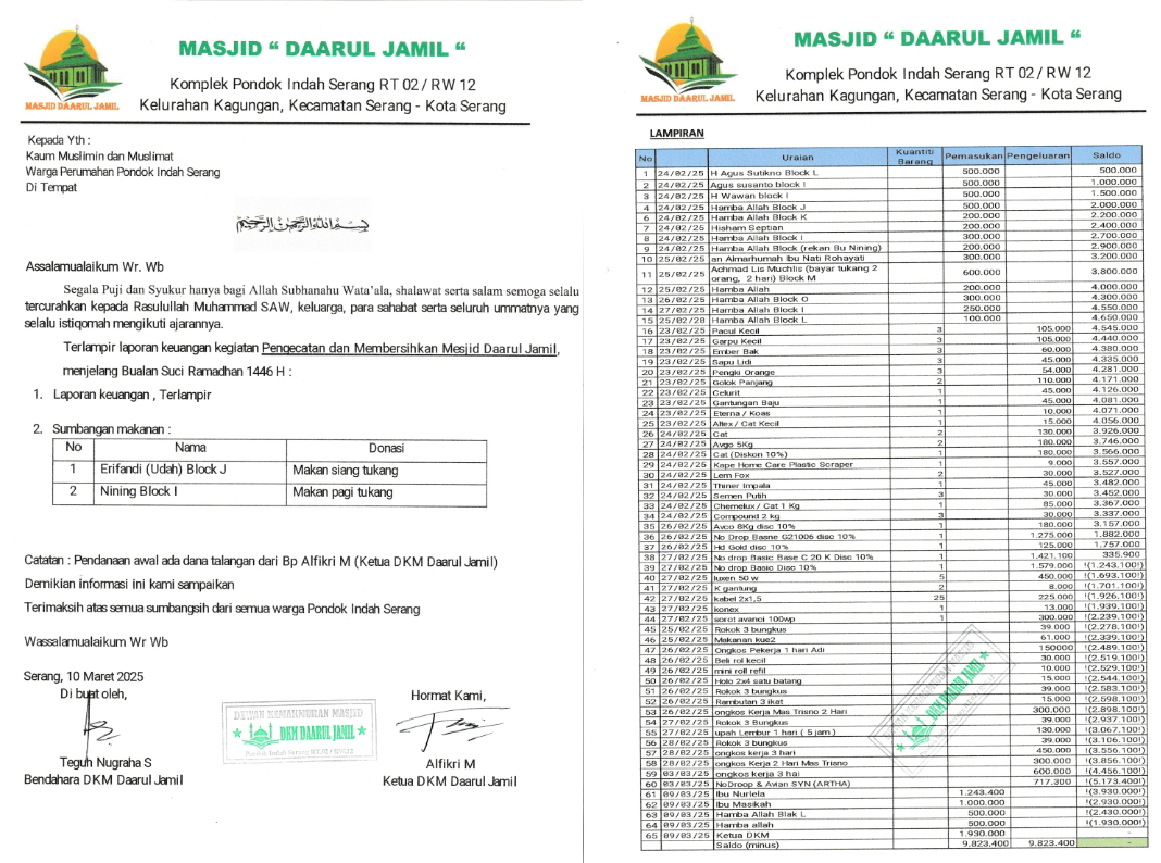 Terlampir Laporan Keuangan Kegiatan Pengecatan dan Pembersihan Masjid Daarul Jamil Tertanggal 24-02-2025 s/d 09-03-2025